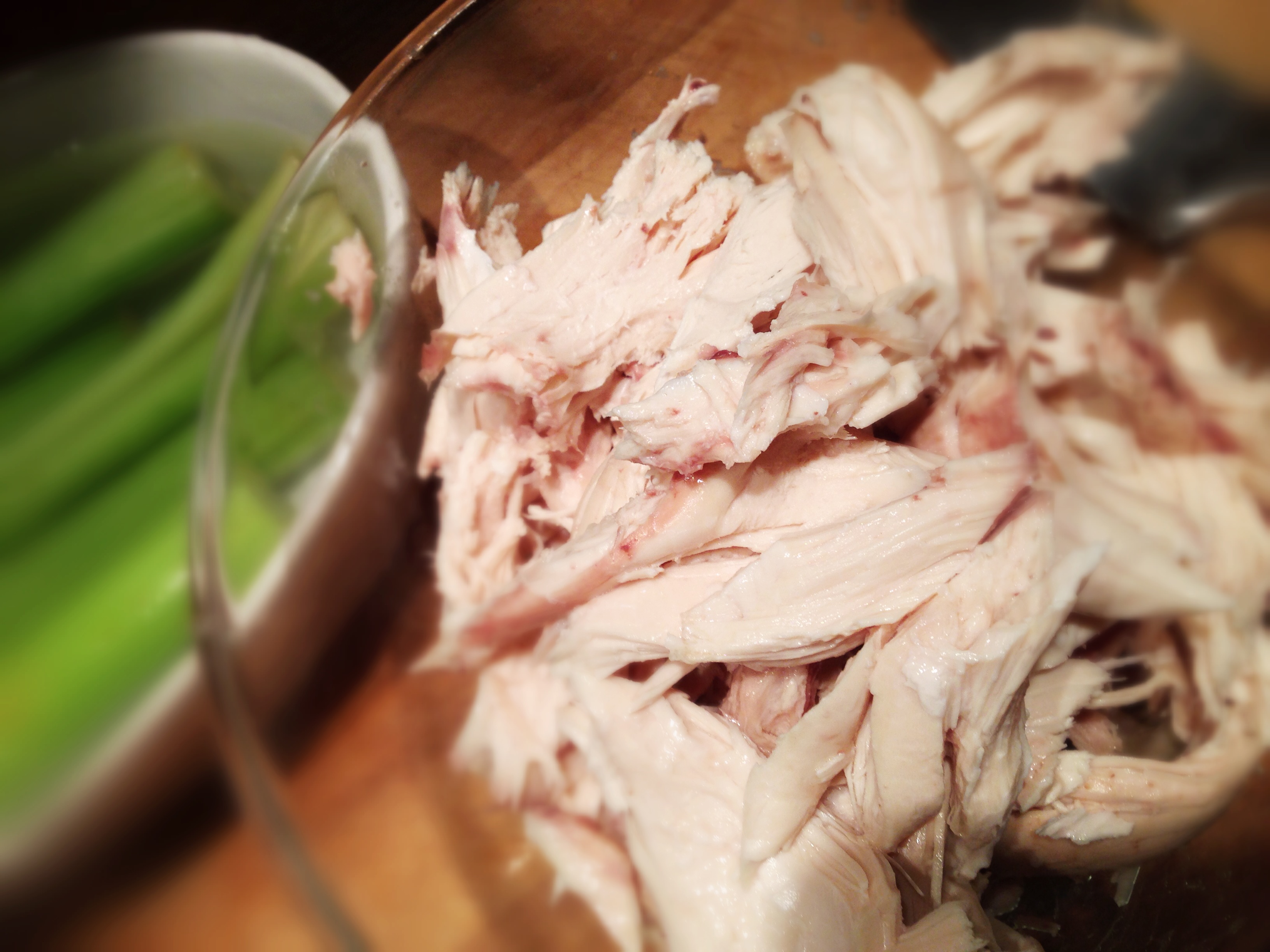 - Retirer les cuisses et les poitrines de poulet (sauf les ailes). Laisser refroidir. Enlever la chair et réserver. Casser les os avec un bon coup de couteau, afin de libérer la moelle. Remplir avec de l’eau jusqu’à 10 cm du bord du chaudron et porter à ébullition. Réduire le feu et couvrir. Laissez mijoter pendant au moins 2 heures.