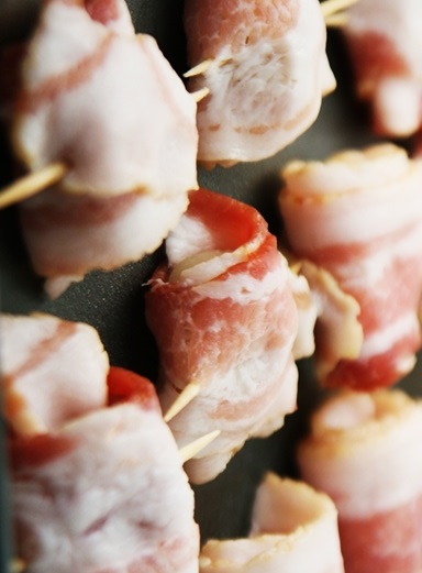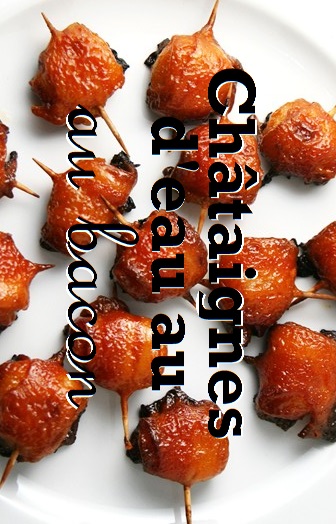 - Enrouler chaque châtaignes dans une 1/2 tranche de bacon et maintenir en place à l’aide d’un cure-dent.