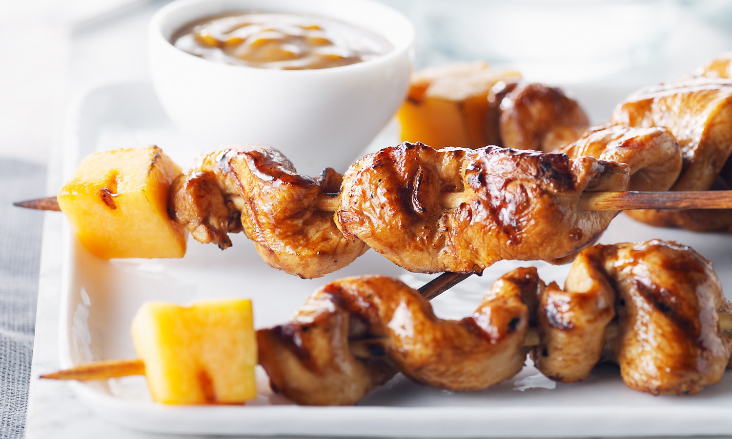 - Faire tremper des brochettes en bambou pendant 30 minutes dans l’eau, pour ne pas qu’elles brûlent au four. Enfiler le poulet et griller au four de 8 à 10 minutes, sur une tôle recouverte de papier parchemin.