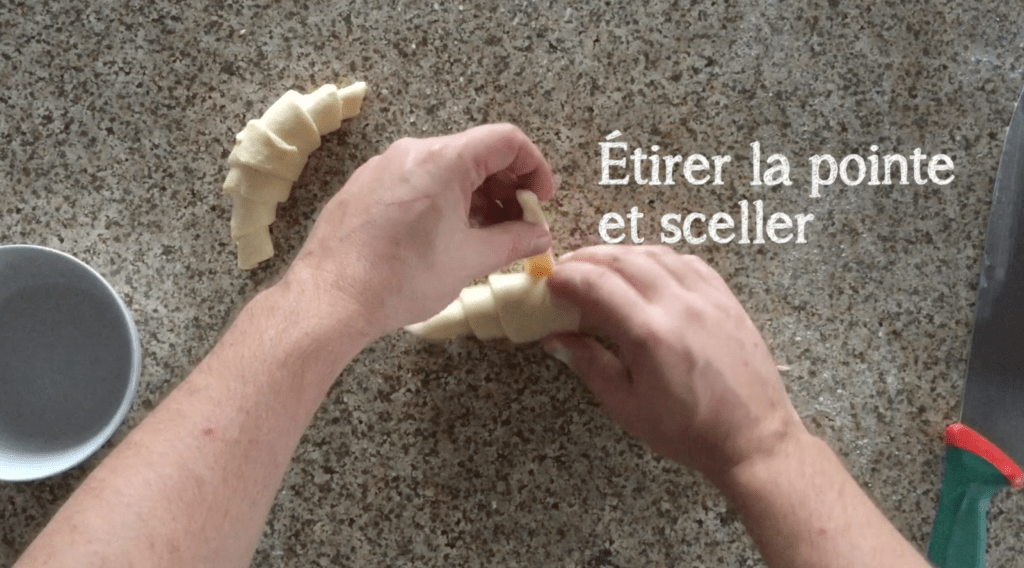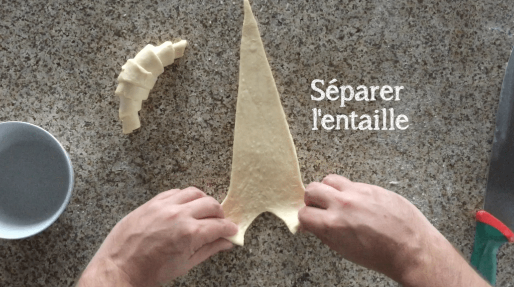 9. Mouiller légèrement la surface de chaque triangle avec de l’eau. Séparer les entailles et rouler le croissant sur lui-même. Sceller et déposer sur une plaque de cuisson, la pointe en-dessous