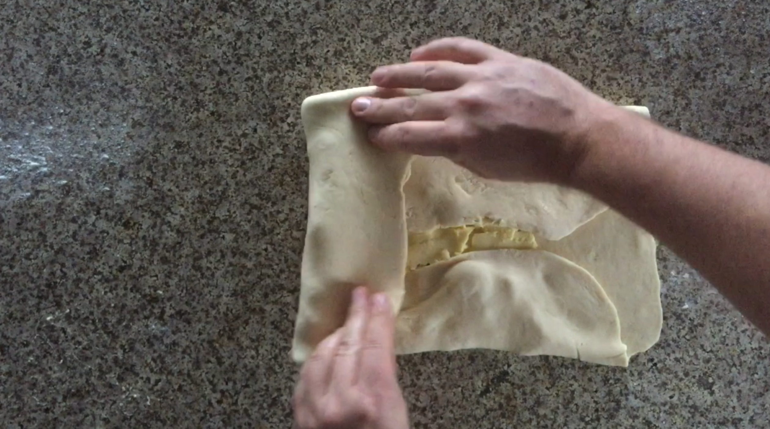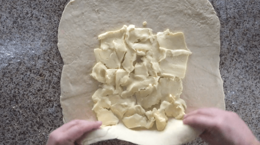 Déposer le beurre froid au centre de la pâte et replier/sceller tous les côtés