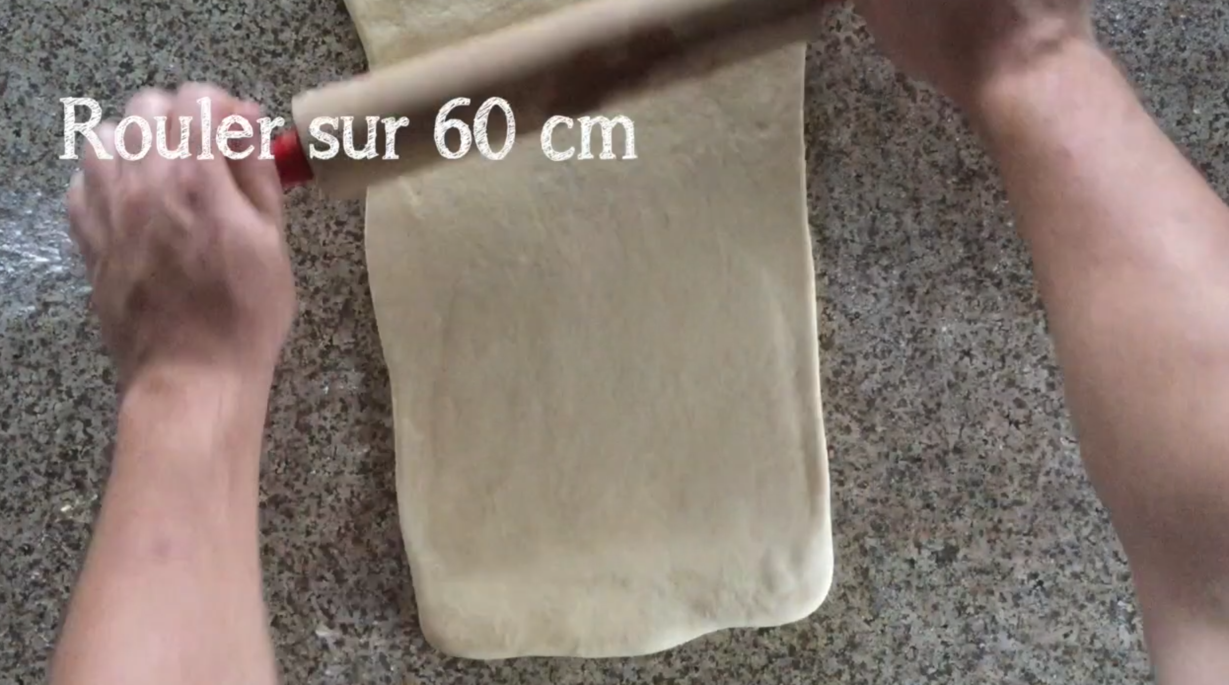 Bien sceller tous les côtés. Il est important que le beurre soit emprisonné dans la pâte.4. Enfariner légèrement la surface de votre pochette de pâte et de beurre et rouler dans un seul sens, jusqu’à ce que la surface atteigne 60 centimètres.