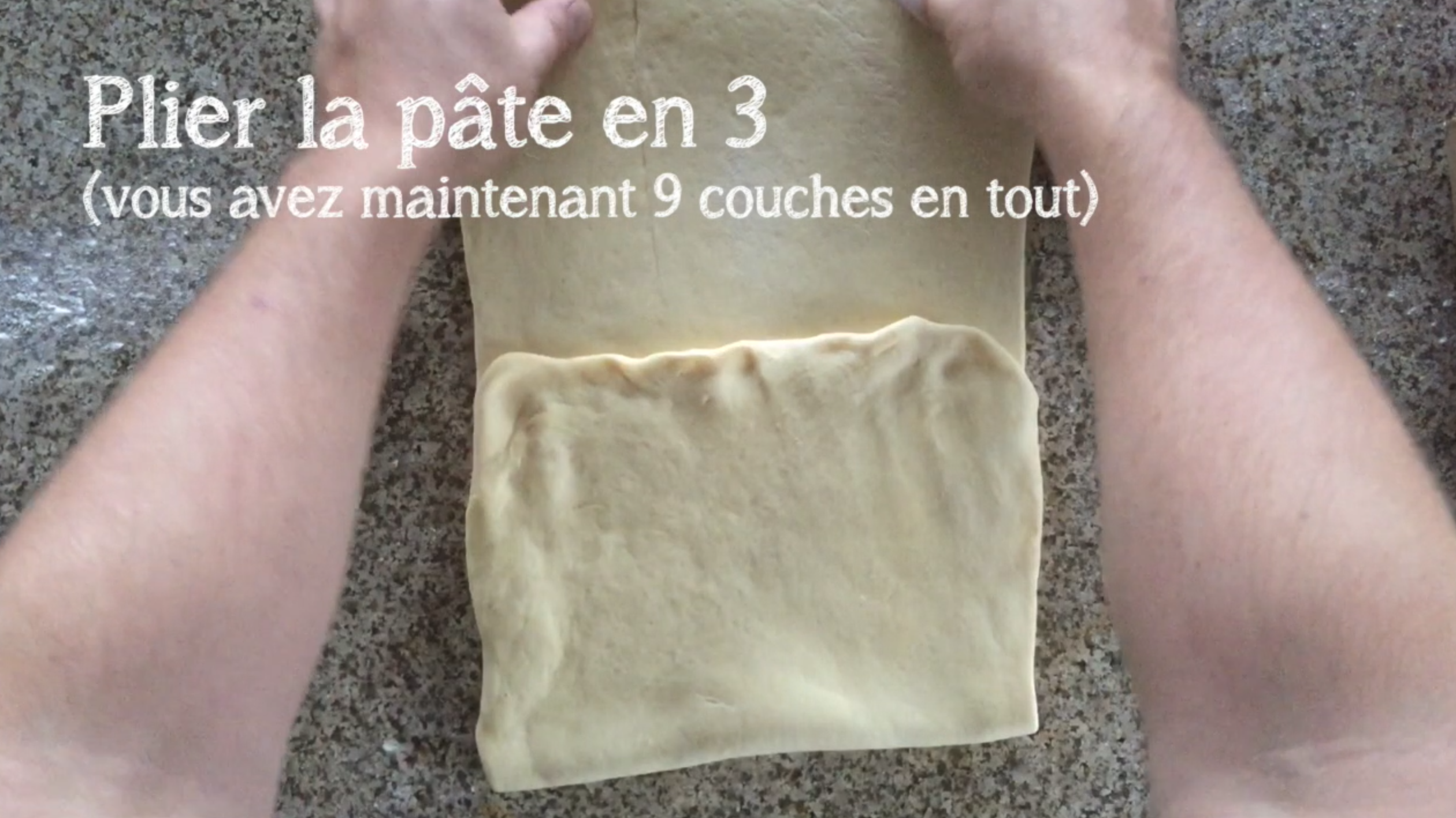 7. Recommencer les étapes 4 et 5 une troisième et dernière fois. Cette fois-ci, emballez d’une pellicule plastique et réfrigérez pendant au moins 1 heure. Cela permet au beurre de se solidifier à nouveau.