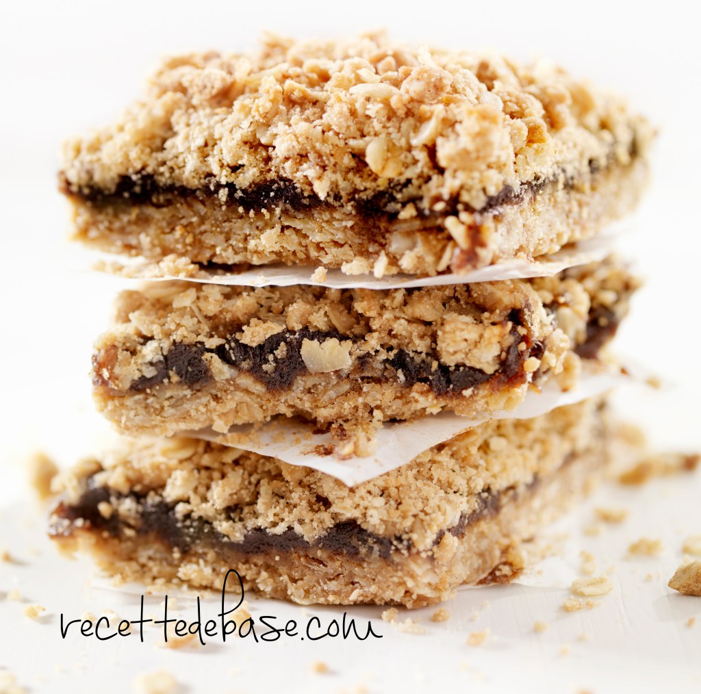 - Dans un moule carré de 8″x8″ (20cm x 20cm) beurré ou recouvert d’un papier parchemin, étendre la moitié de la préparation de flocons d’avoine. Recouvrir du mélange de dattes et compléter avec le reste de la pâte.