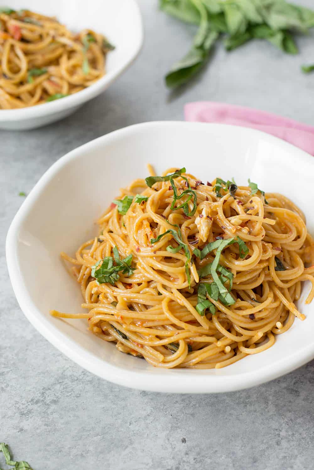 5. Incorporer les pâtes dans la sauce et laisser cuire environ 4 à 5 minutes à feu moyen-élevé. Si elle trop épaisse, ajouter de l’eau de cuisson. Ajouter le basilic et servir immédiatement.